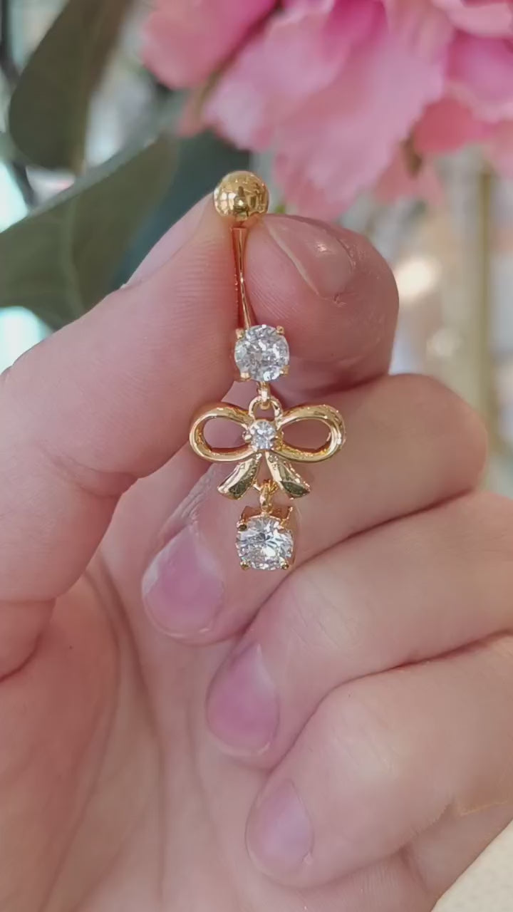 This dangling belly button jewelry features a lovely round-edged flower with a medium-sized decorative part hanging from it.