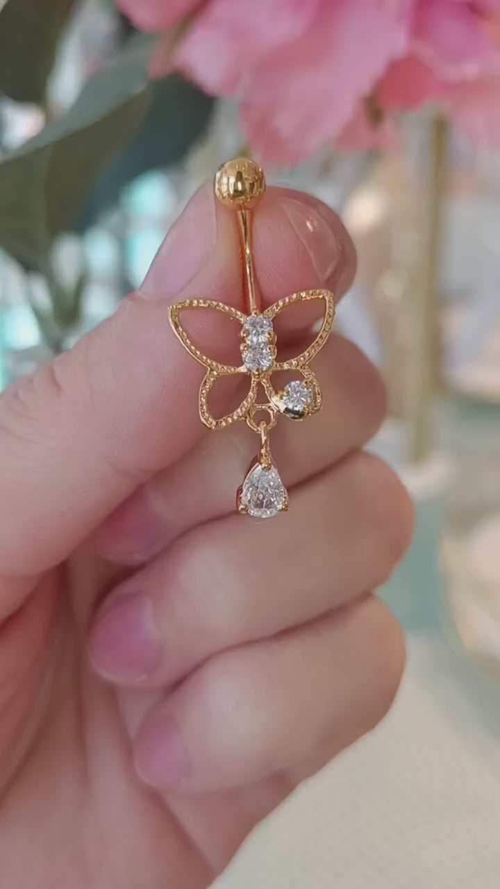 This dangling belly button jewelry features a lovely round-edged flower with a medium-sized decorative part hanging from it.