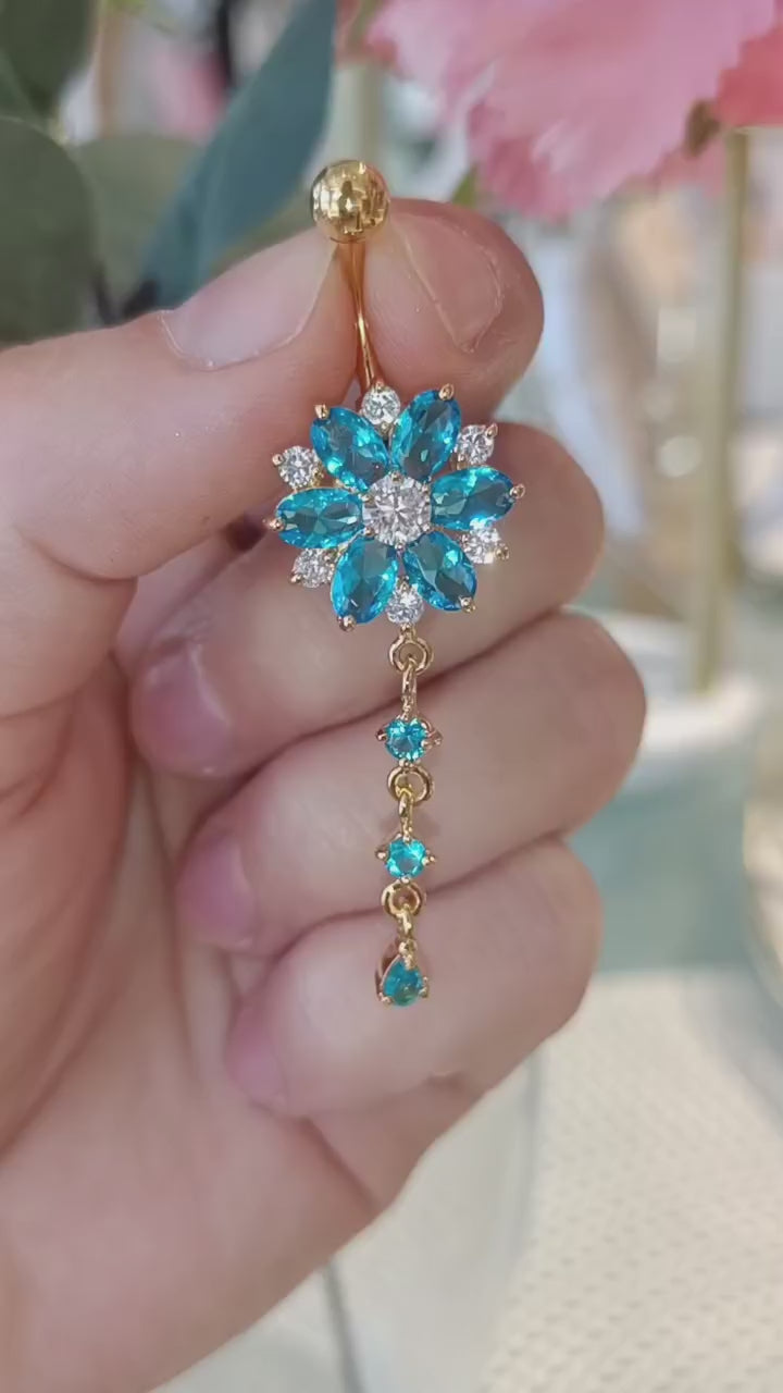A beautiful crystal-embellished belly button with a gorgeous dangling decoration, perfect for beach days to add sparkle to your belly button. The top ball of the jewelry is 5mm and the bottom decoration is 3cm. The crystals in the bottom are attached to the jewelry with a claw setting so they stay on the jewelry really well.