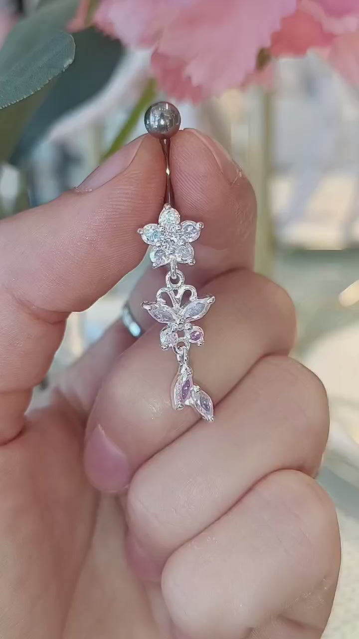 Upeasti kaikissa sateenkaarenväreissä kimaltava aurora borealis -värinen kristallikoristeinen titaaninapakoru on yksi suosituimmista malleistamme. Sirolla roikkuvalla perhoskoristeella varustettu napakoru sopii hyvin rantapäiviin tuomaan kimallusta napaasi.